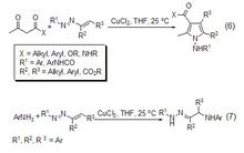 得到相应的吡咯衍生物 (式6)。此外,氯化铜还能催化水、醇和芳香胺对芳基偶氮烯烃的加成反应 (式7)。