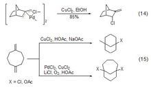 氯化铜还能与钯配合物反应,如π-烯丙基钯配合物在氯化铜作用下发生氧化断裂反应,释放出氯化钯,同时得到烯丙基氯化合物(式14)。这种氯化铜对钯配合物的作用可用于实现烯丙基化合物的二聚反应,如1,5-二亚甲基环辛烷在氯化钯和氯化铜作用下发生关环反应 (式15)。