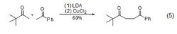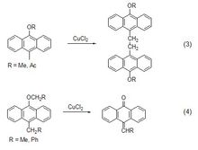 氯化铜也能实现芳香环化合物的氯化反应,如在四氯化碳中作用于苯酚或烷氧基苯化合物实现邻位或对位的氯化反应 (式2)。含活泼亚甲基的化合物如9-烷氧基-10-甲基蒽与氯化铜反应能得到偶联产物 (式3),然而结构相似的9-烷基-苄基蒽在氯化铜作用下则发生自由基反应得到10-苯亚甲基蒽 (式4)。酮或酯在二异丙基氨基锂LDA作用下得到的锂化烯醇式结构能被氯化铜氧化为1,4-二羰基化合物。如叔丁基甲基酮和苯乙酮在LDA和氯化铜作用下发生交叉偶联反应 (式5)。氯化铜能催化β-二羰基化合物对芳基偶氮烯烃的1,4-加成反应,