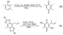 在氧气存在下,氯化铜能氧化苯酚为苯醌化合物。如在CuCl2/胺/O2催化下将2,3,6-三甲基苯酚转换为三甲基对苯醌 (式8)。此外,烷氧基苯酚,甚至苯并唑也能被氯化铜和氯化铁体系氧化 (式9)。