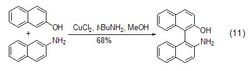 除了胺配体外,烷氧基配体也能与氯化铜作用实现萘酚的氧化偶联,并且选择不同的配体和控制氯化铜与配体的比例能选择性实现底物的自身偶联或交叉偶联反应。如在苄胺配体存在下实现萘酚与萘胺的交叉偶联反应 (式11)。