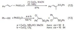 氯化铜还能催化烷基和芳基磺酰氯对不饱和键的加成反应,如苯磺酰氯与烯烃在氯化铜和碱作用下发生加成反应得到乙烯基砜 (式12),苯磺酰氯与苯乙炔在氯化铜和不同添加剂作用下得到顺式或反式β-氯乙烯基砜的反应 (式13)。