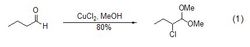 氯化铜是一个对多种官能团化合物有效的氯化试剂,能实现羰基化合物如丁醛的α-氯化反应。反应通常在含氯化锂的极性溶剂中进行。当反应在质子溶剂如甲醇中进行时,则得到α-氯化二甲基乙羧醛 (式1)。