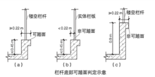 《民用建筑设计通则》6.6.3条注释规定:栏杆高度应从楼地面或屋面至栏杆扶手顶面垂直高度计算,如底部有宽度≥0.22 m,且高度≤0.45 m的可踏部位,应从可踏部位顶面起计算。