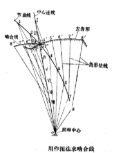 直线OI为两非圆齿轮的中心连线方向。过节曲线上的任意点1、2、3、4……,作该齿的齿形法线1-1'、2-2'、3-3'、4-4'……。点1'、2'、3'、4'……为齿形上的对应点。非圆齿轮传动时,这些点便与共轭齿形上的对应点依次接触。接触点的轨迹即齿形啮合线。如在某一位置,两齿形在3点接触,3点既是齿形啮合线上的线,又是齿形与节曲线的交点,且位于两齿轮中心连线上。当齿轮副转动后,齿形上的4'与其共轭齿形相切。相切点的公法线4-4'上的4点(节曲线上的点)将落在中心连线IV点位置。因4和4'点位于一刚体上,故△O44'是一刚体三角形。当它绕O点转动、4点落在IV点时,4'的新位置4''即所求的齿形啮合线上的点。同理可求出齿形啮合线上的点1''、2‘’、5‘’、6‘’、7‘’……。点1''、2''、3''、4''、5''……的轨迹即齿形啮合线2。