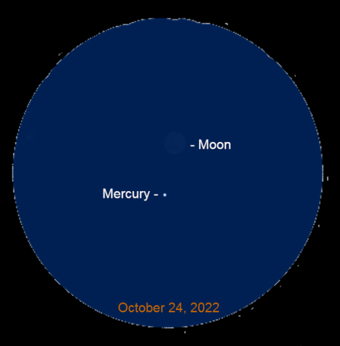 鉴于晴朗的天空和一览无余的地平线,你很可能只用眼睛就能看到月亮和水星。新月将在10月23日变得更厚、更亮,但那天早上会离水星更远。请记住,新月的被照亮的一面将指向水星。