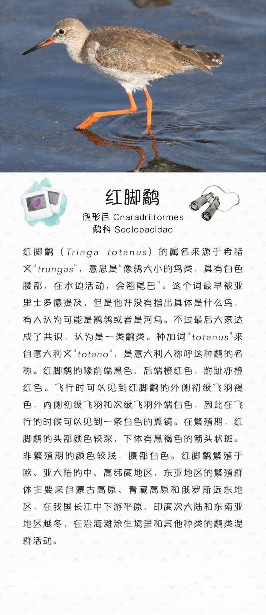 图文简介: 红脚鹬(学名:Tringa totanus):体长28厘米,飞行时腰部白色明显,次级飞羽具明显白色外缘。尾上具黑白色细斑。虹膜黑褐色,嘴长直而尖,基部橙红色,尖端黑褐