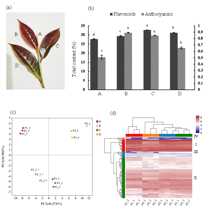 2023年2月,Beverage Plant Research 在线发表了贵州大学茶学院茶树资源育种团队题为 Integrated Transcriptome and Metabolome Provide Insights into Flavonoids Biosynthesis in ‘P113’, a New Purple Tea of Camellia tachangensis 的研究论文。该研究将新梢的芽、第一叶、第二叶和第三叶,作为不同紫化和发育阶段的茶树样品,结合转录组学和代谢组学分析了样品的基因表达变化和黄酮类代谢物的变化,从而初步明确大厂茶紫化资源 ‘P113’的新梢在发育过程中的紫化规律。随着新梢的发育,从芽到第三叶呈现不同程度的紫化现象,并且总黄酮含量先增加后减少,总花青素含量在芽中最低,第一叶达到最高后逐渐降低。PCA分析和代谢物聚类分析也证明了在新梢的发育过程中代谢物发生了明显的量的变化(图1)。代谢产物谱与转录组、转录组和蛋白质相互作用之间的相关性表明,转录因子MYB12和糖基转移酶UGT78D2对新梢紫化具有良好的促进作用(图2)。该研究阐明了‘P113’新梢着色的代谢途径和潜在基因,丰富了特异珍稀的茶树种质资源以及新品种选育的知识。
