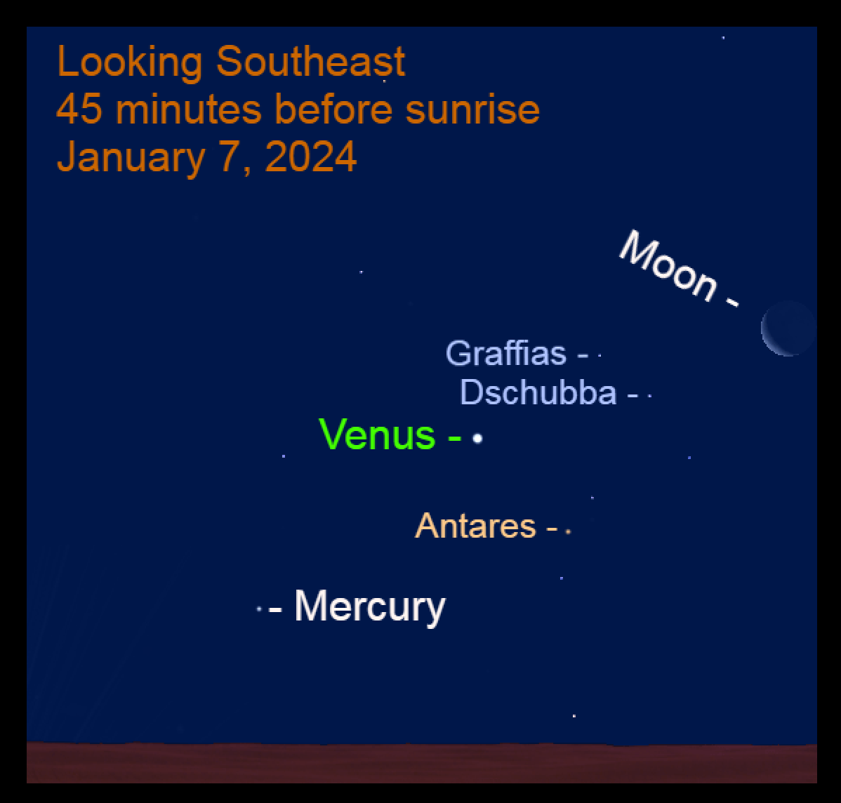 图表说明-2024年1月7日:金星-心宿二合相。日出前,金星于天空东南方经过心宿二的夹角为 6.3°。邻近为新月和水星。