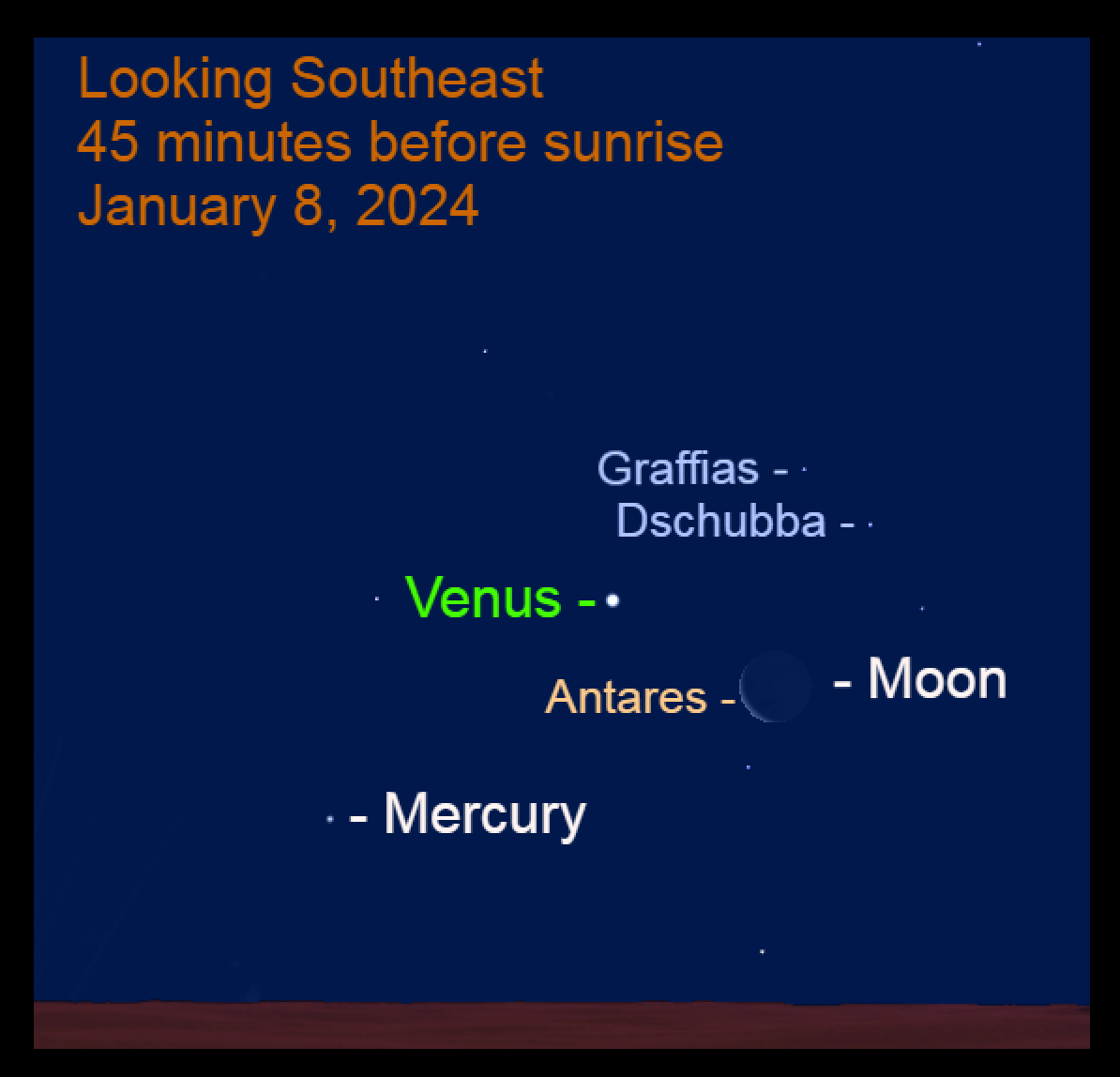 图片说明- 2024年1月8日:金星、月球、心宿二聚集在同一个双筒望远镜视野中。