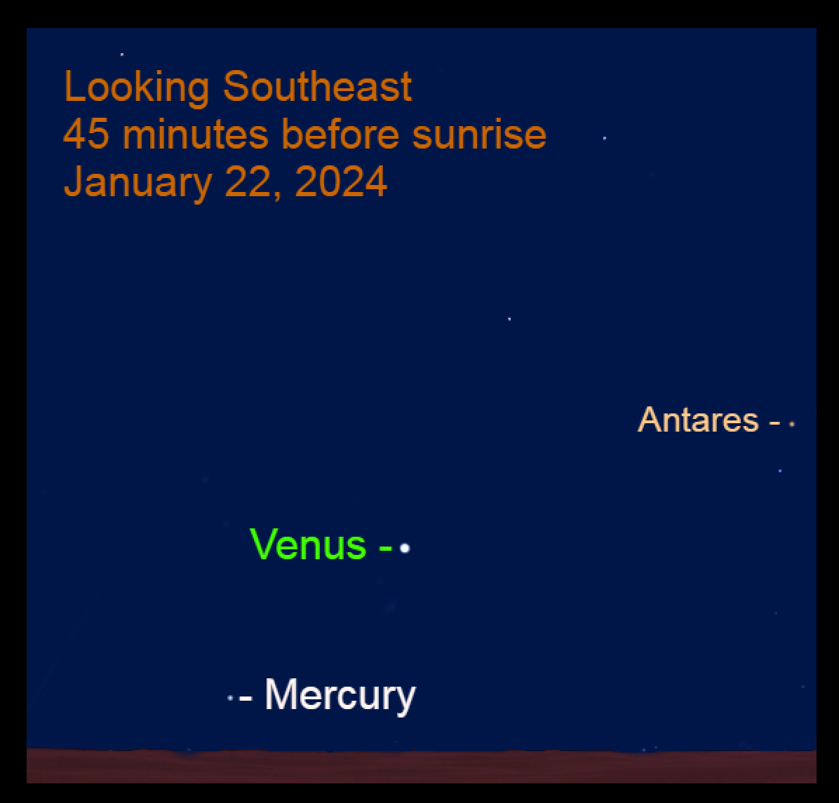 2024年1月22日:当水星进入更明亮的暮色时,我们向冬天告别。金星指引着通往这颗难以捉摸的行星的路。日落后可以看到木星、土星和月球。