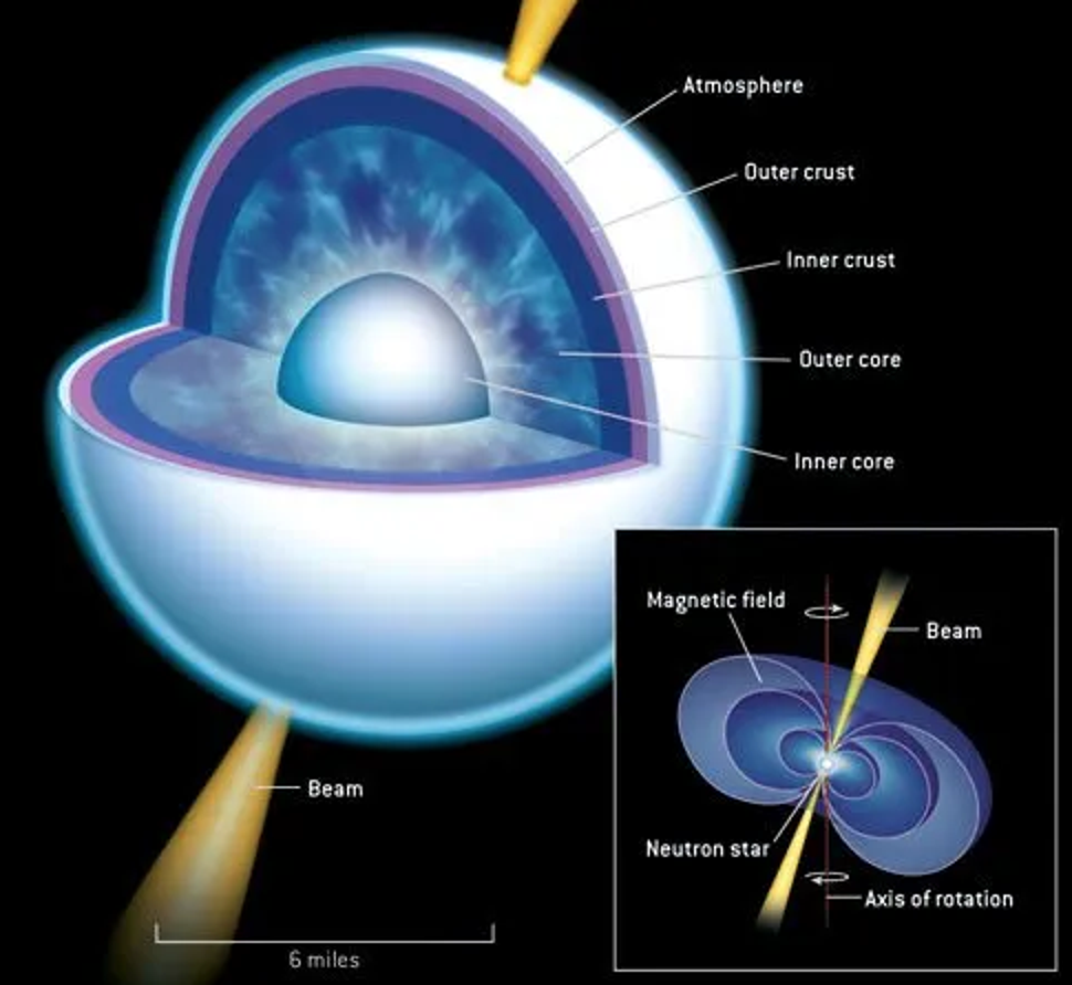 正是由于其构成成分,中子星才被称为中子星——一颗在引力作用下形成的超密度、高质量却只有城市规模大小的中子态。中子星的内部结构的研究仍存在很多争议。近期一项研究指出,他们跟踪研究的一颗中子星上有着一层薄薄的金属外壳,仅有约一米厚,在这层外壳下,是大量不同形态的中子。