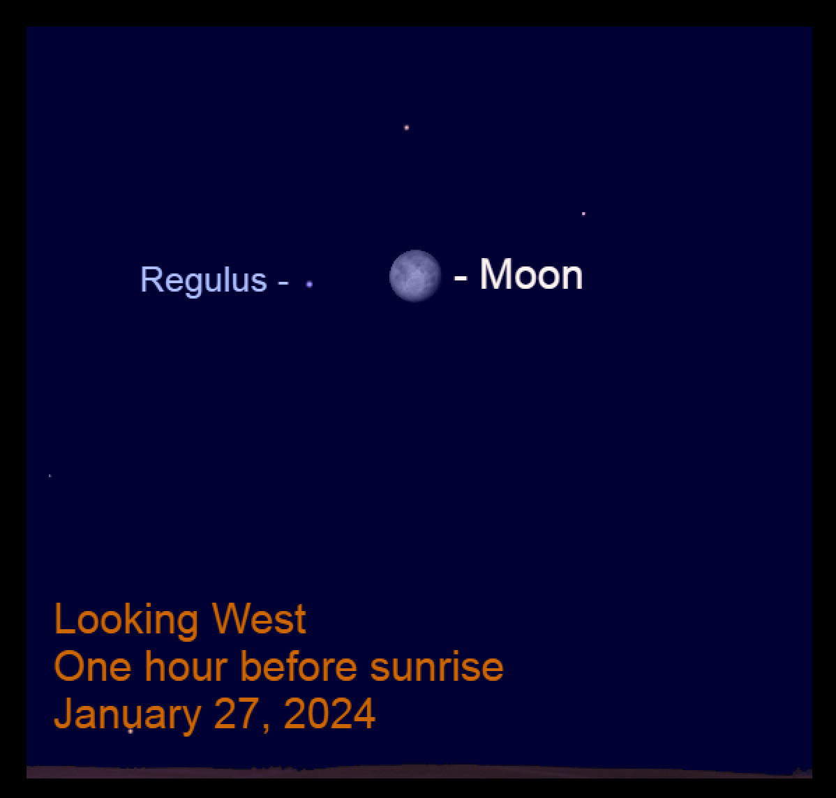 图表标题-2024年1月27日:日落三小时后,月亮在轩辕十四附近的东方天空低垂。