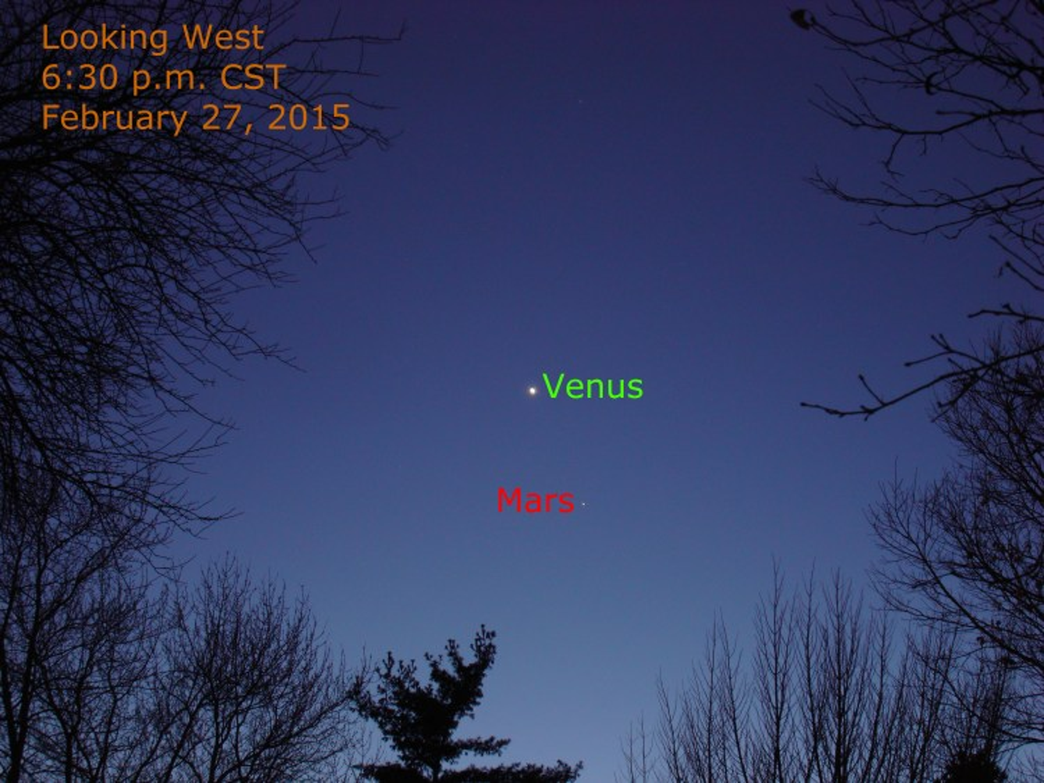 图表标题–2024年2月21日:用双目望远镜来看,金星在火星的上方。