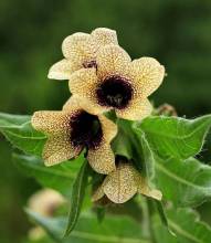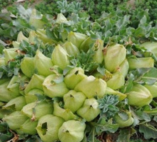 天仙子 | 分布于中国北部和西南部,生于山坡、路旁及河岸沙地,草地,全体被粘性腺毛。茎生叶卵形或三角状卵形,基部半抱茎,花单生叶腋,在茎上端聚集成蝎尾式总状花序,花冠黄色而脉纹紫色,花萼在果时增大成坛状而包围蒴果,种子淡黄棕色,在中药中称天仙子,有镇痉、止痛之效。 | |