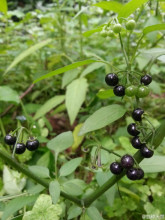 龙葵 | 广布欧洲、亚洲和美洲,喜生田边、荒地及村庄附近;草本,叶卵形,蝎尾式聚伞花序有3~10朵花,花冠白色,浆果球形、紫黑色;全株入药,有散瘀消肿、清热解毒的功效。 | |