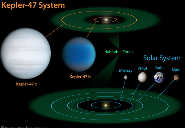 “行星形成于环绕着一颗年轻恒星的物质盘中,在那里,物质逐渐聚集成星球。在环双星系统之中,这个物质盘环绕两颗恒星形成。由于两颗恒星相互绕行,它们就像巨大的脚踏板那样扰乱物质盘里靠近它们的区域。这阻止了行星的形成,除了在那些离双星很远且未受扰动的位置。相较于我们太阳系这样的单恒星系统,在环双星系统中,行星形成的位置和条件更容易被探明。“