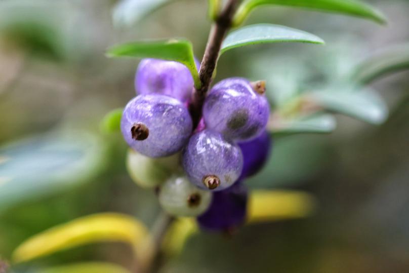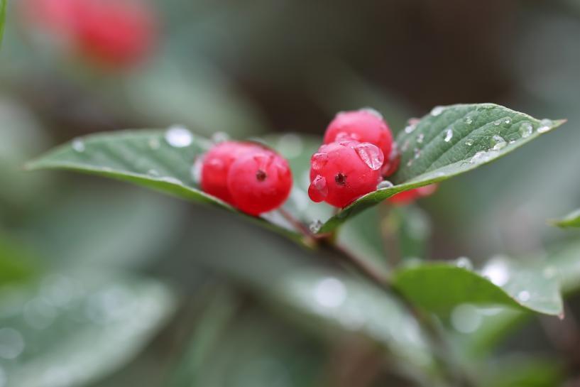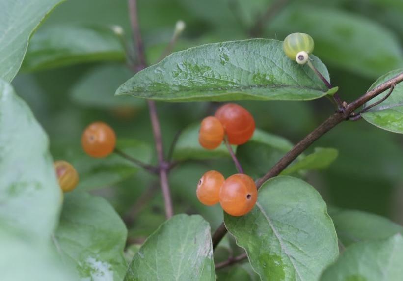 忍冬属中,我所见过最接近沙雁果的,是亮叶忍冬(Lonicera ligustrina var. yunnanensis Franch.)的一个品种——“匍枝”亮叶忍冬(ligustrina var. yunnanensis 'Maigrun'),果实发育过程中会从绿色逐渐向紫色转变,有时还会出现白色和浅紫色,逆光望去,成熟的果实颇为动人,种子的作用下还会形成深色斑点。
