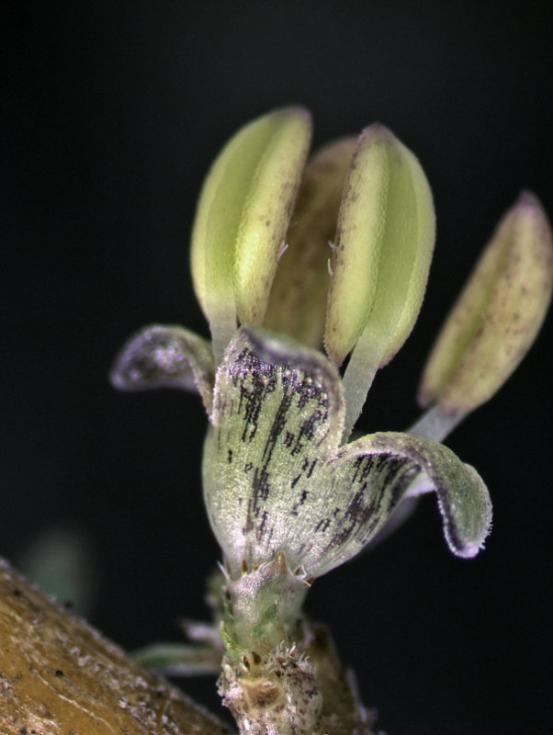 好多人不知道的是,沙雁果是雌雄异株植物,它的雌雄花都很小,单生于短枝的顶端,直径只有2-3mm,花冠呈漏斗状,4到5裂。它的雌花花冠裂片呈狭窄的长圆形,有4到5个萼片,盛开时两根黄绿色毛茸茸的柱头伸出花外;而雄花花冠裂片呈卵状长圆形,萼片缺失或退化,但有融合成杯状的苞片和4到5枚雄蕊。