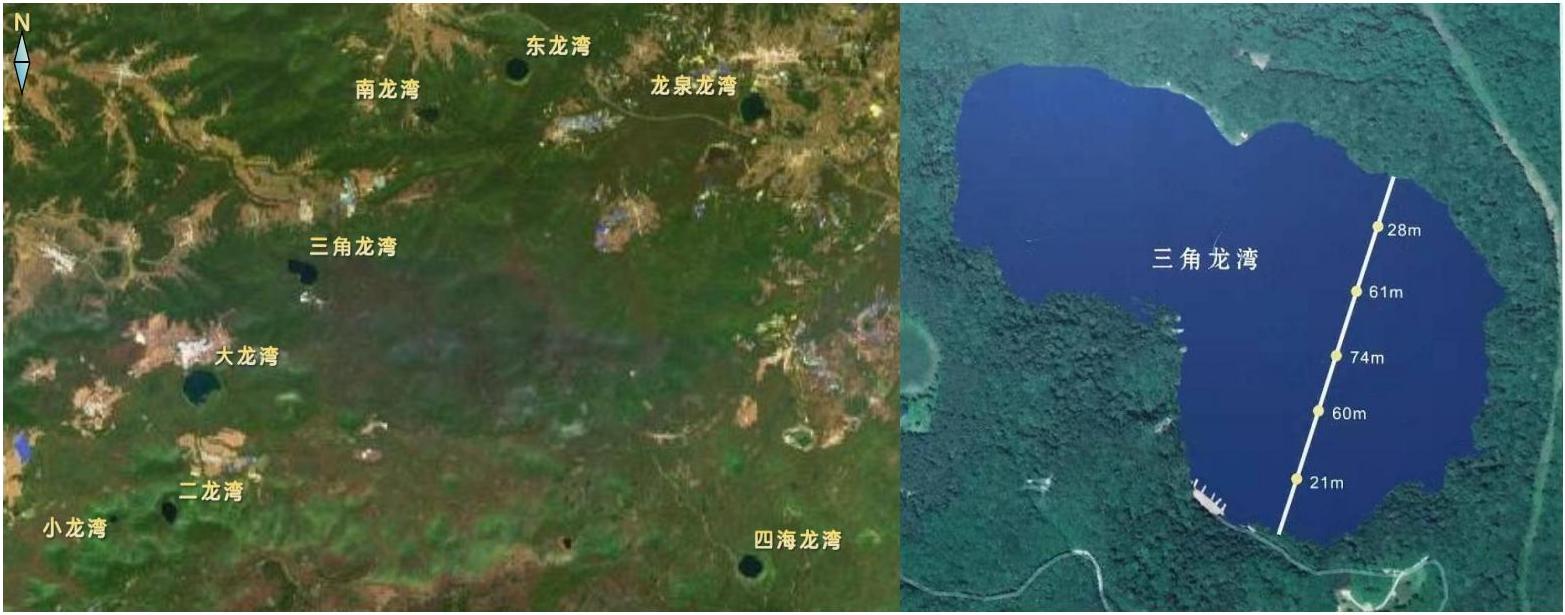 吉林省龙岗火山群“八龙湾”空间展布图(左图)和三角龙湾火山俯瞰图(右图)(均为原创图件)