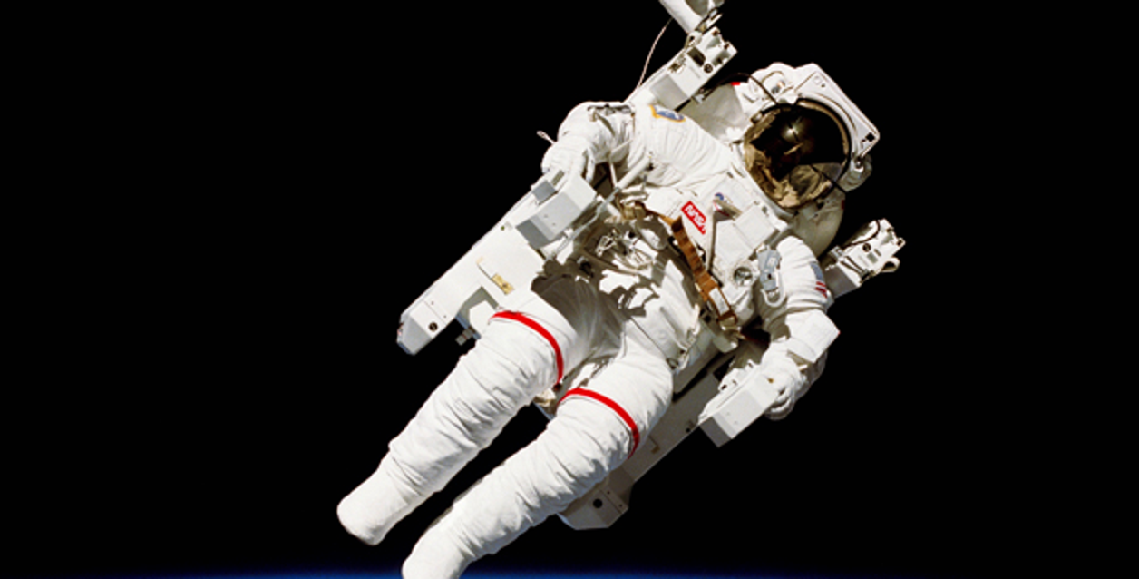 一片黑暗中,宇航员只有头盔上的灯可以用来指引方向...