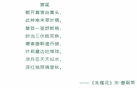 疑若焰生、朝开暮落的朱槿花,在我国古代文学记载中非常丰富,被赋予了深厚的人文内涵。“瘴烟长暖无霜雪,槿艳繁花满树红。每叹芳菲四时厌,不知开落有春风。”唐代诗人李绅就在诗中赞叹,“无霜雪”环境下生长的朱槿花四季常美。