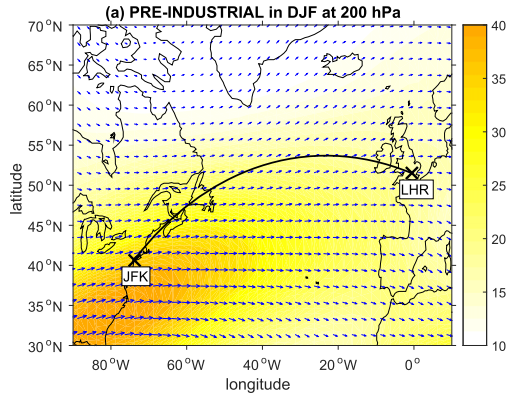 上面两张图展示了气候变化对跨大西洋航线风速的影响。左图是在前工业时期,北大西洋上空的西风带相对较弱,而右图在二氧化碳浓度加倍的情境下,西风带显著增强。这种变化意味着从纽约飞往伦敦的航班将会因为更强的顺风而更快,而从伦敦返回纽约的航班则可能因为更强的逆风而更慢。