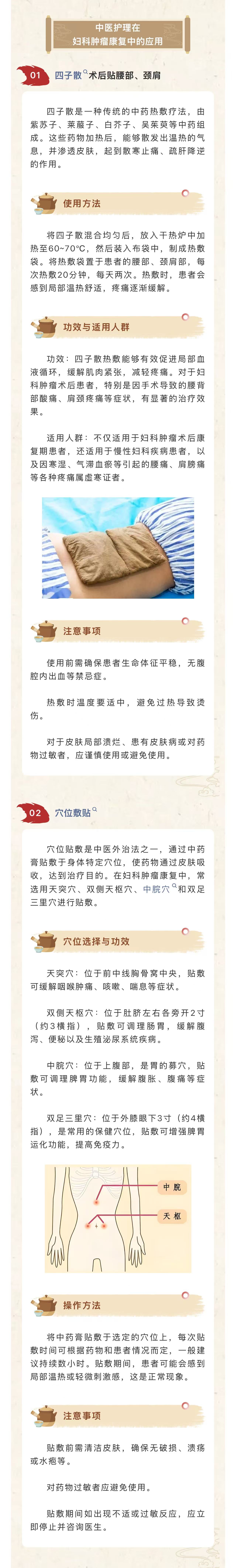 图文简介: 本科普内容旨在深入浅出地介绍中医护理在妇科肿瘤康复中的应用,让更多人了解并认识到中医护理的潜在价值,为患者提供一种温和而有力的辅助治疗选择,助力她们在康复之路上走得更稳、更远。