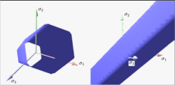 图3显示了Drucker-Prager屈服面在主应力三维空间中的表面。它是一个常规的锥体。椭圆弹性域是σ1,σ2的平面上的锥体的横截面。可以选择它在不同数量顶点的莫尔 - 库仑屈服面相交。一个选择是在σ1=-σ2行的任一侧的三个顶点处与Mohr-Coulomb屈服面相交,但通常按惯例选择是压缩机制中的那些。另一个选择是在两个轴上的四个顶点(单轴拟合)或对角线上的两个顶点σ1=σ2与Mohr-Coulomb屈服面相交(双轴拟合)。Drucker-Prager屈服准则也通常以材料内聚力和摩擦角表示。4