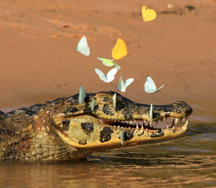 ▲巴西潘塔纳北部,一只凯门鳄的“眼泪”引来了需要补充盐分的蝴蝶(来源:视觉中国)
