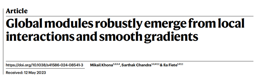 近期的研究在此基础上提出了一种结合两者优点的新理论——峰值选择原理(peak selection principle)。这一理论展示了全局模块是如何从局部相互作用和平滑梯度中自发涌现的。这项研究解释了多种场景中的模块化形成的机制:从大脑中栅格细胞对空间地标的周期性编码,到蝴蝶翅膀上的分形斑纹,再到大堡礁珊瑚在时间和空间上的同步繁殖。这揭示了模块化不仅是动态适应复杂环境的高效策略,也是自然界中广泛存在的重要组织原则。