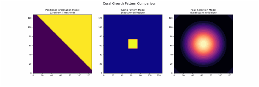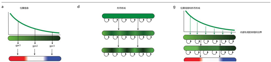 下面的图,对比了基于位置的,图灵局部相互作用的,以及峰值选择的模型,对应三种模型的不同特点,分布是梯度模型的确定性边界形成,图灵模型的自发模式涌现,以及峰值选择模型的自适应。