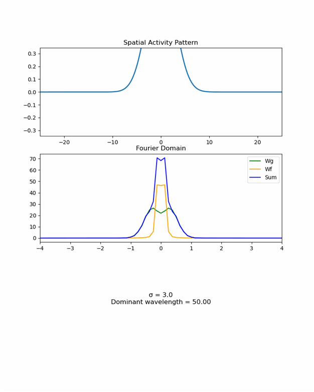 从科学角度而言,该模型的核心是“双尺度抑制”(dual-scale inhibition)机制,它包含两个关键组成部分:即包含固定尺寸的全局相互作用W_f,以及在更小尺度上发挥作用的局部互作W_g。这两种作用的综合效应创造了模块化的涌现条件。从下面的动图可以看到:当移动的W_g频谱峰跨越W_f的固定栅栏结构时,系统是如何选择最近的允许模式,从而产生离散的模块化结构的。