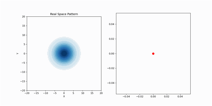 上述过程在二维空间的展示,如下所示,其中存在蓝色代表的沿X轴的全局抑制作用,以及左图对应的局部的相互作用,两者的共同影响,促成了左图的模式产生,图中可看到,随着临界点的到达,原有模式失稳,快速跃迁至更大尺度出现对应的模式。