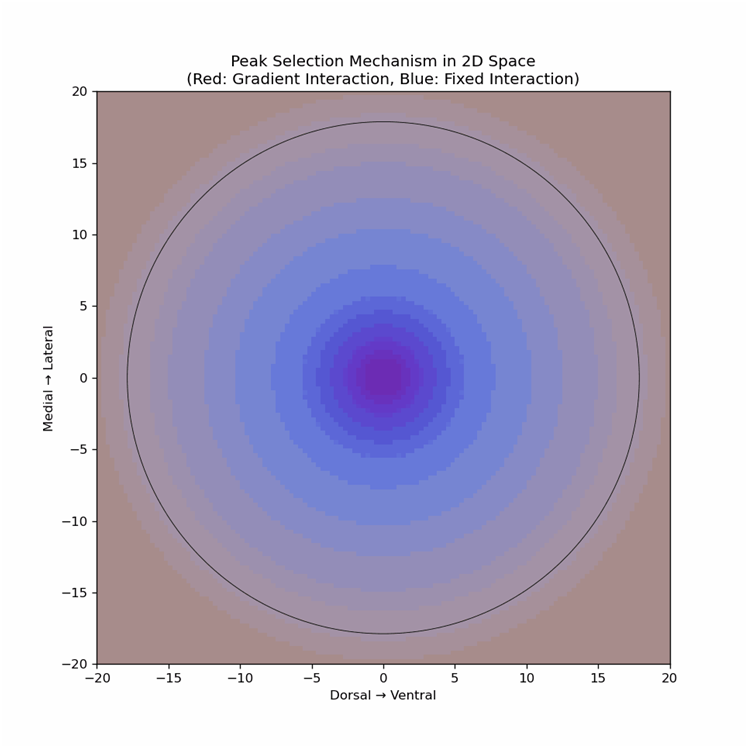更具体的机制描述,可见下图,其中紫色区域为两种机制共同作用,纯红色区域对应局部梯度机制主导,而纯蓝色区域对应固定机制主导,黑色等高线为模块的边界,动图中的背景条纹是峰值选择模型形成的空间周期模式。从该图可看出,梯度机制(红色)沿X轴的强度变化,以及固定机制(蓝色)的全域周期性结构。