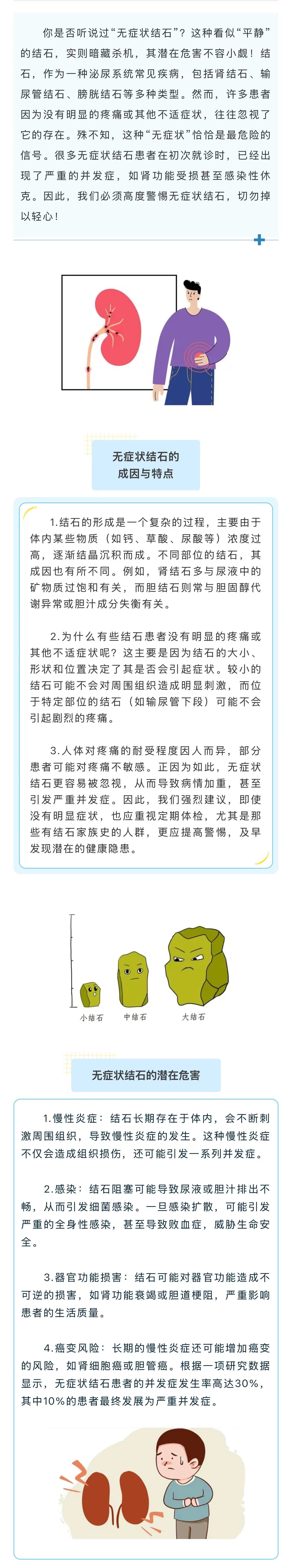 图文简介: 你是否听说过“无症状结石”?这种看似“平静”的结石,实则暗藏杀机,其潜在危害不容小觑!因此,我们必须高度警惕无症状结石,切勿掉以轻心!