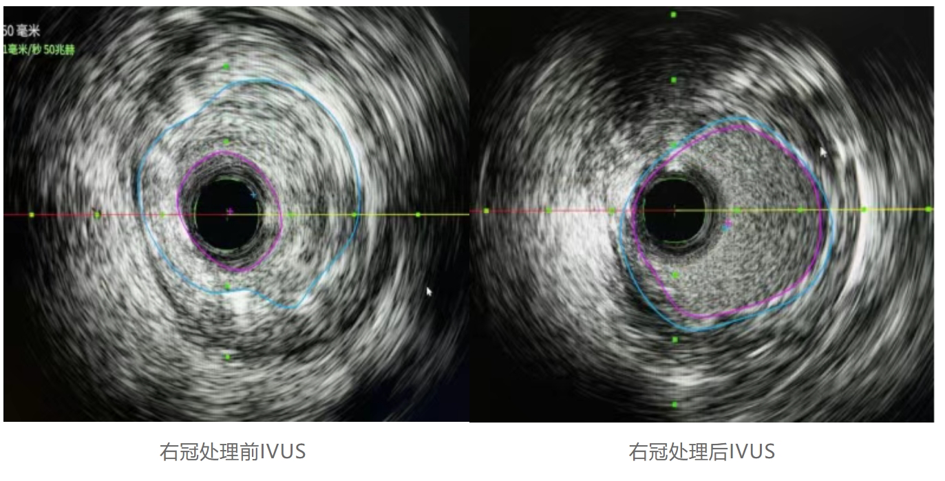右冠处理情况:右冠处理前IVUS提示斑块负荷75%,管腔面积1.93mm²,经准分子激光斑块消蚀术处理后斑块负荷19%,管腔面积6.55mm²。
