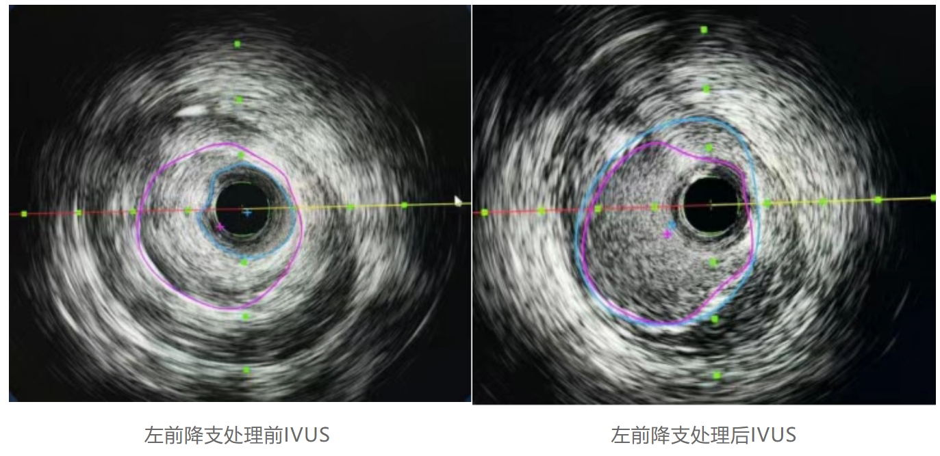 左前降支处理情况:左前降支处理前IVUS提示斑块负荷68%,管腔面积2.22mm²,经准分子激光斑块消蚀术处理后斑块负荷21%,管腔面积7.17mm²。