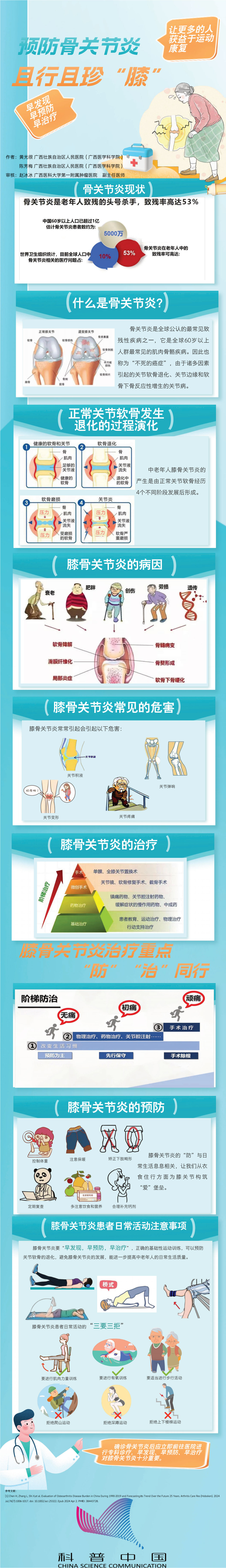 图文简介: 作品介绍了骨关节炎的主要表现,深入探讨了该疾病的多种病因,并阐述了骨性关节炎对个人生活质量的影响,强调了预防重点在于维持健康体重、适度锻炼、增强关节周围肌肉力量以及避免长时间保持同一姿势。