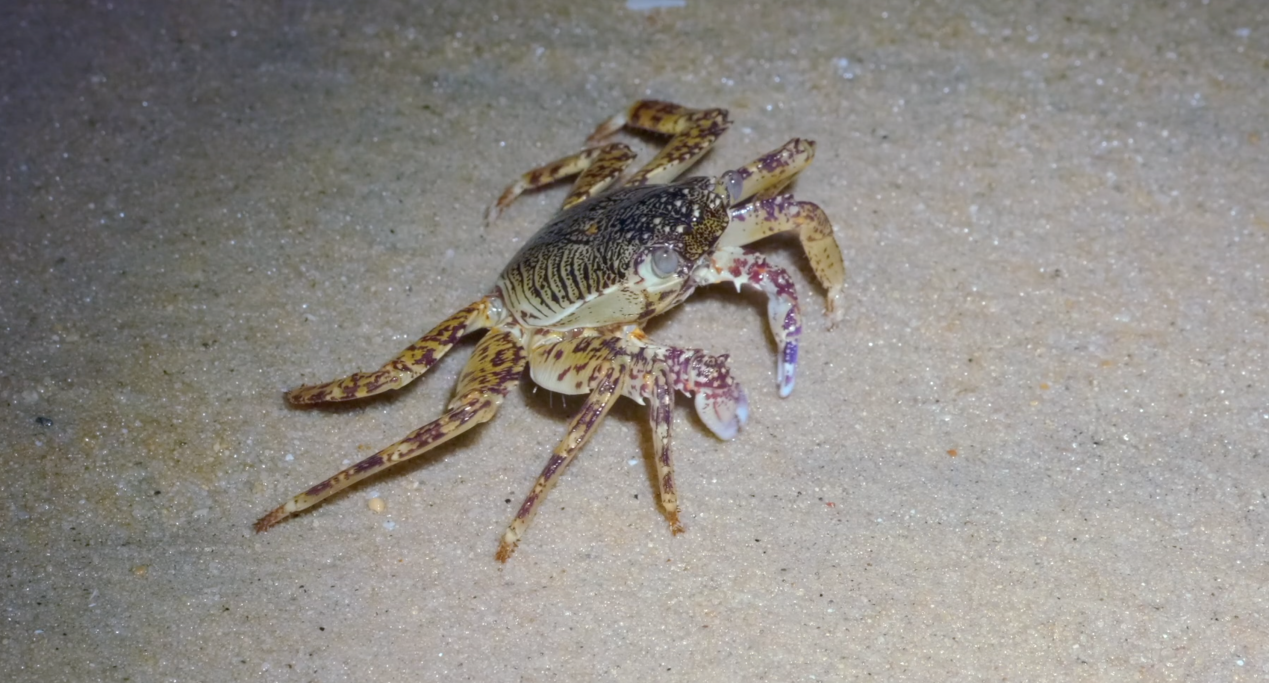 在水中,还有许多活动灵活、快速穿梭的小蟹,它们其实是寄居蟹,是极其重要的“清洁工”。大多数寄居蟹来者不拒,会吃所有发现的有机质,甚至随处可见的沙粒都会成为它们的“美食”。寄居蟹会使用第二、第三对足将沙粒刨到腹下,再用触肢送入口器中进行反复筛选,将沙粒上附着的藻类或浮游动物吃掉。它们都长有一双突出的眼睛,视力非常好,嗅觉和触觉也异常灵敏,这得益于它们羽状的触须,能够精准感受到水流变化和数米外的食物。日落后,方蟹也会爬到礁石滩上觅食活动,它有着八只有