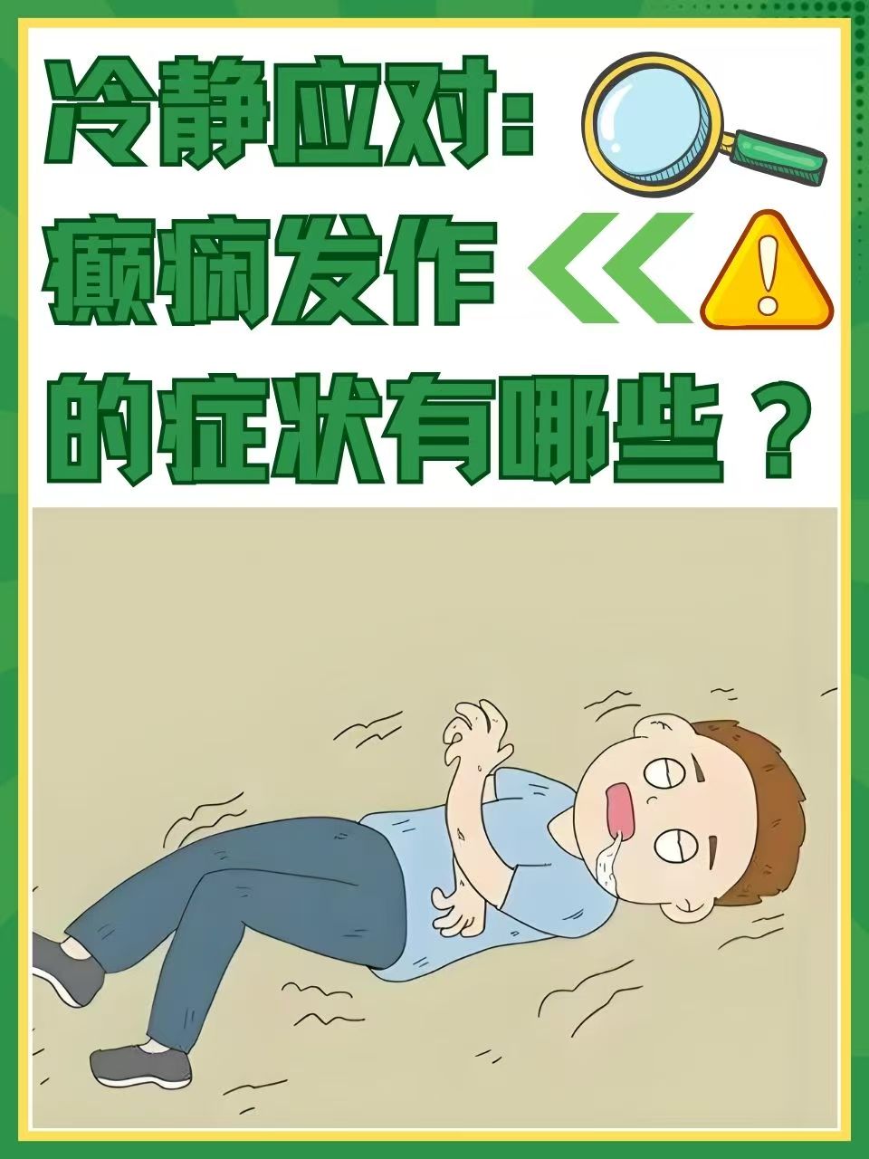 - 强直 - 阵挛发作(大发作):突然意识丧失、全身抽搐、口吐白沫,持续1-3分钟;