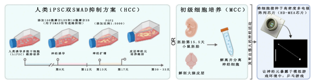 这个被称为DishBrain(培养皿大脑)的系统,并非完整的脑类器官,而是在高密度微电极阵列(HD-MEA)芯片上培养的约80万个活体脑细胞,其来源包括人类iPSC分化的皮质神经元和小鼠胚胎神经元。研究人员将这套系统命名为Cyborg(赛博格)。在这个实验中,电极负责向神经元传递“球”的位置信息,神经元则通过产生电信号来尝试移动屏幕上的“球拍”进行回击。