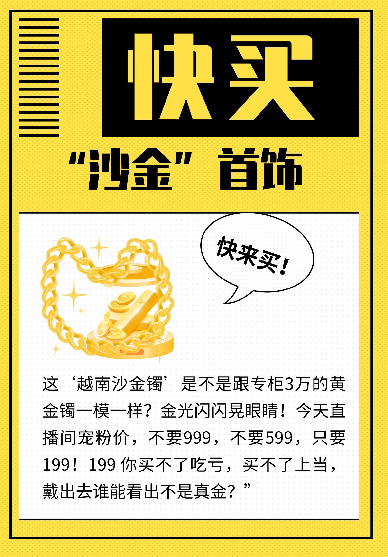 法律界人士也说了,这种“以假充真、以次充好”的操作,要是销售金额够数,商家可是要面临罚金、拘役甚至有期徒刑的!所以啊,想买金首饰的家人们别贪小便宜了,要么咬咬牙买真金(至少有保值性),要么就买明确标注“合金”“镀金”的饰品,别被“沙金”这俩字忽悠了,到时候钱花了,胳膊还遭罪,多不值当!