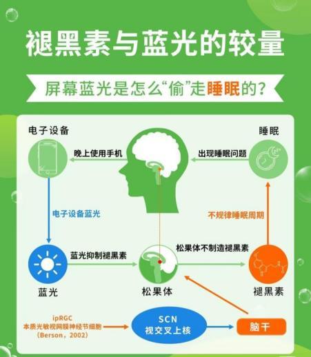 褪黑素是一种调节生物钟和睡眠觉醒节律的激素,它的分泌受光线影响。当环境光线变暗时,褪黑素的分泌增加,促进人体进入睡眠状态;反之,环境光线变亮时,褪黑素的分泌会减少,促进人体进入觉醒状态。蓝光会通过视网膜感光细胞抑制褪黑素的产生,导致入睡困难、睡眠质量下降。睡前使用电子设备会使褪黑激素的分泌延迟,让你更难进入睡眠状态。