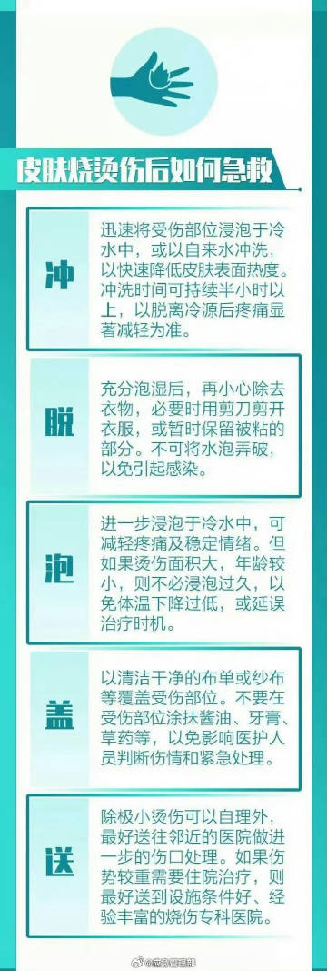 日常生活中突发意外或受到外伤,如果不能及时处理,有可能会危及生命。皮肤烧烫伤后如何急救?戳图学习