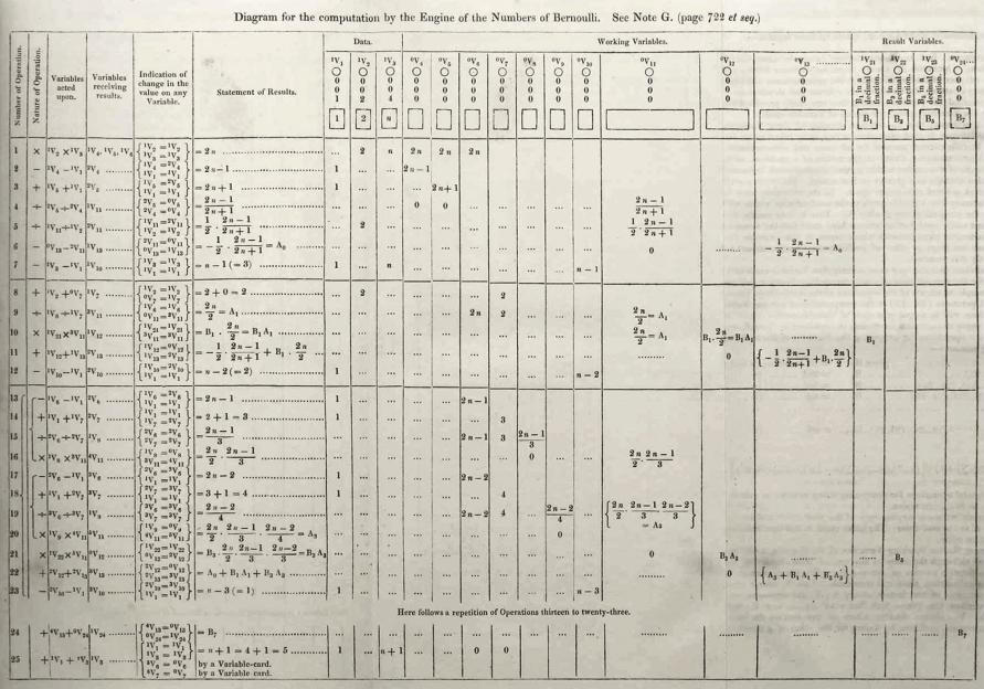 经过九个月的潜心钻研与不懈努力,爱达交给巴贝奇一份比原本文章还长三倍的详尽笔记。在这份笔记中,她不仅详细阐述了分析机的运作原理,更写出了史上公认的首条计算机算法,以供新型机器使用。这一创举,不仅让爱达成为了计算机程序的先驱,更让计算机的潜能有了突破性发展的可能。她所提出的计算机程序概念,以及循环等算法系统,至今仍被广泛应用在我们的计算机中。