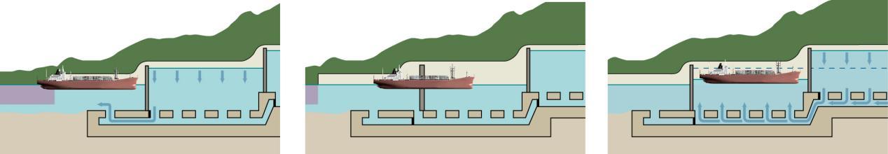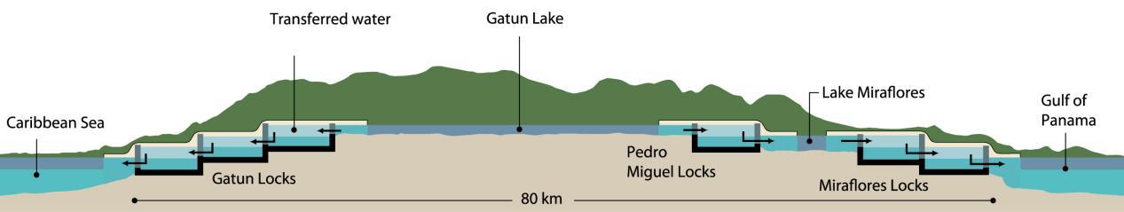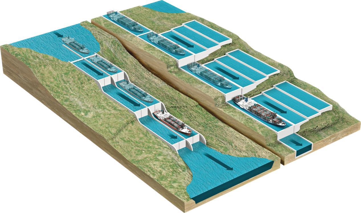 巴拿马运河的三级船闸机制是其另一大亮点。通过精密的水位控制与闸门开关,船只能够平稳地从一侧运至另一侧。首先,第一闸室会注入1亿升的淡水,使水面与海面等高。待水面高度一致后,闸门缓缓开启,船只进入第一闸室。随后,水阀与闸门再次关闭,第二闸室内的水流入第一闸室,使两闸室水面保持平衡。船只便在这样的过程中逐步前行,直至抵达另一侧。