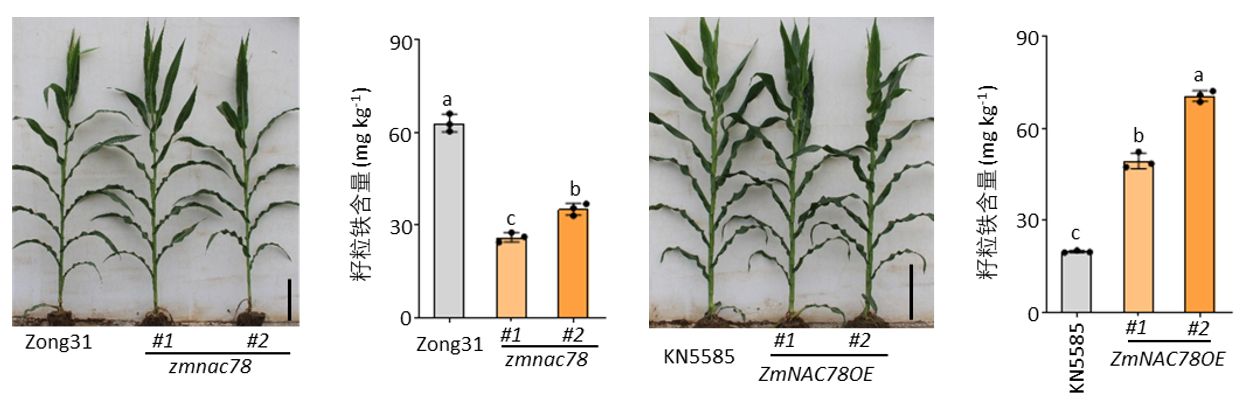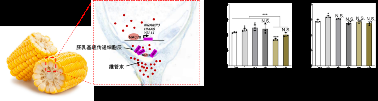 通过全基因组关联分析和转录组测序,发现了一个名为ZmNAC78的基因,它就像一个“营养转运开关”:当这个基因活跃时,玉米母体吸收的铁能高效转运到籽粒中;若基因功能缺失,铁就会“滞留”在茎叶中,无法进入籽粒。
