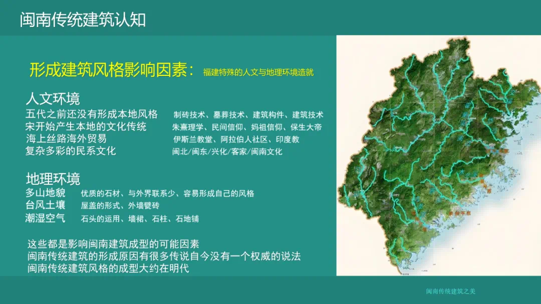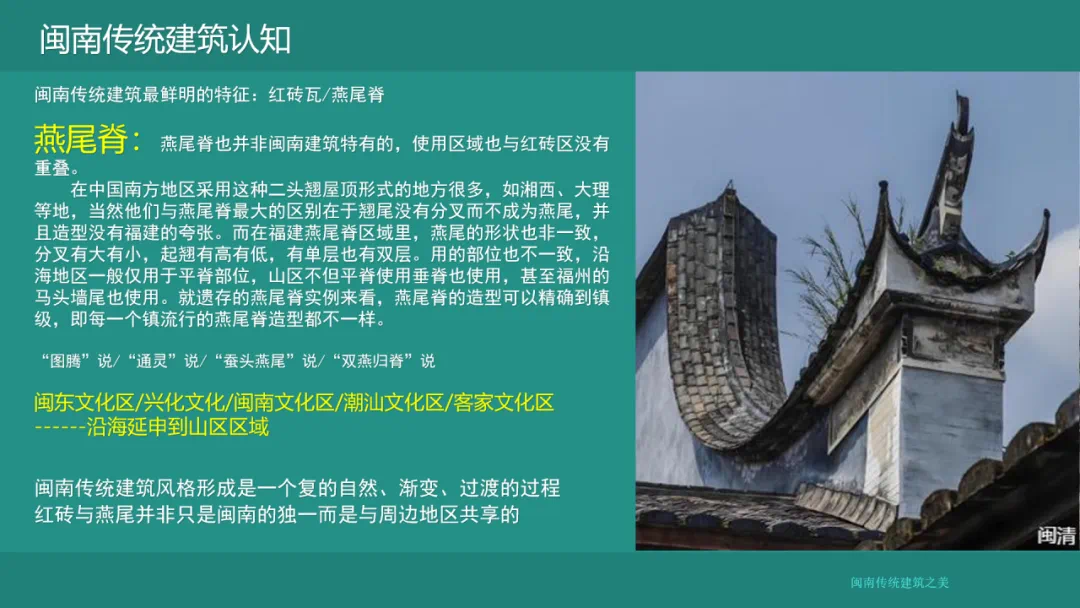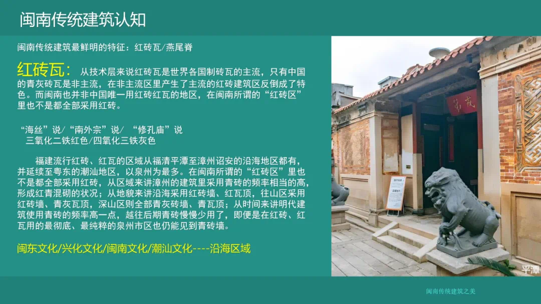 随后的视觉与文化分析环节,何老师逐一讲解了“红砖白石”搭配的材料学与美学效果,以及“燕尾脊”等代表元素、建筑颜色形制的实际功能与象征意义。他还展示了门窗上常见的木雕和屋脊上的剪粘装饰,解释这些技艺是如何体现闽南地区特有的民俗信仰和艺术表达方式。该部分不仅呈现了建筑的外观特点,也揭示了其背后的实用功能与文化内涵。