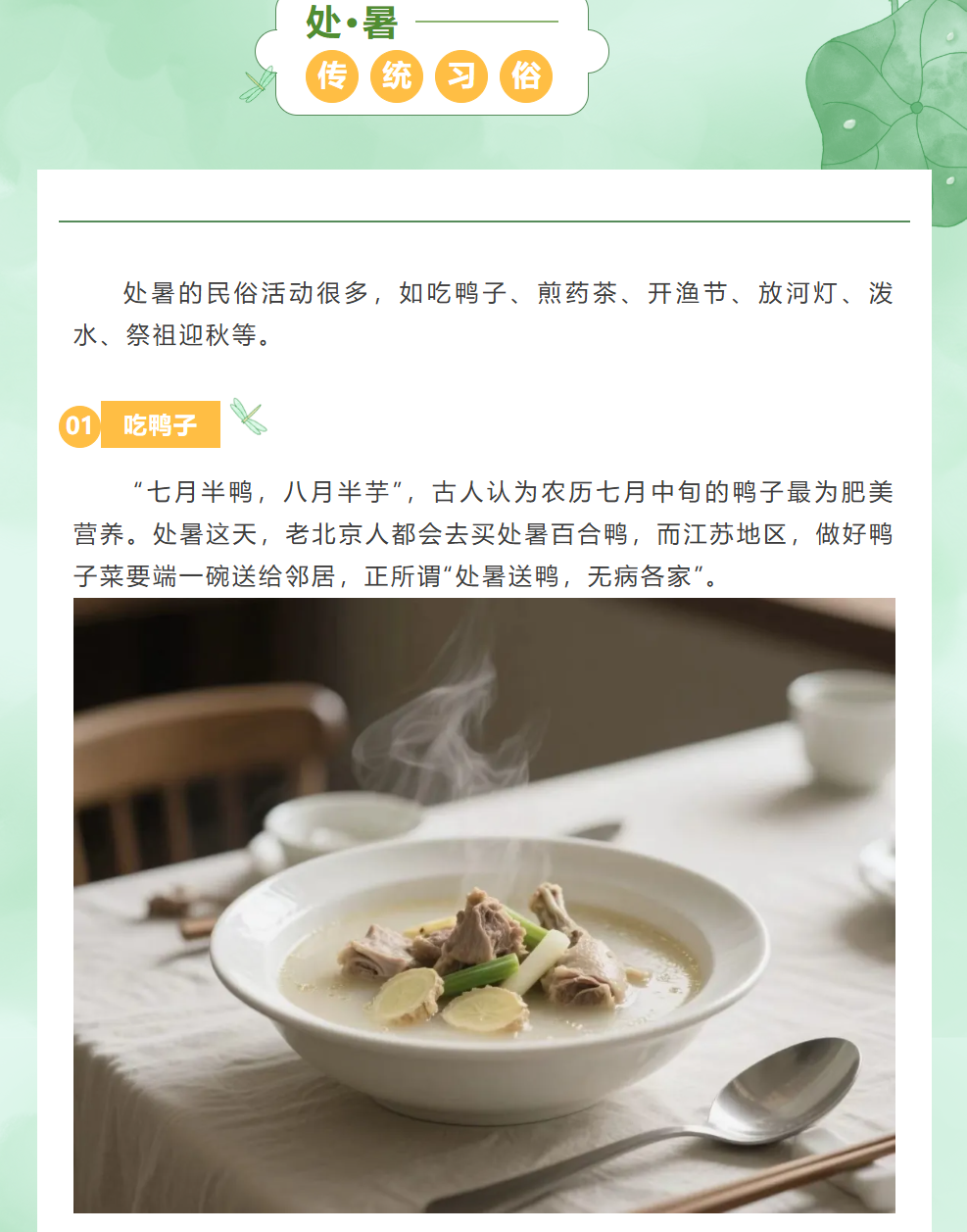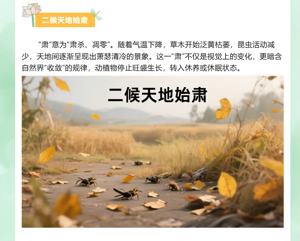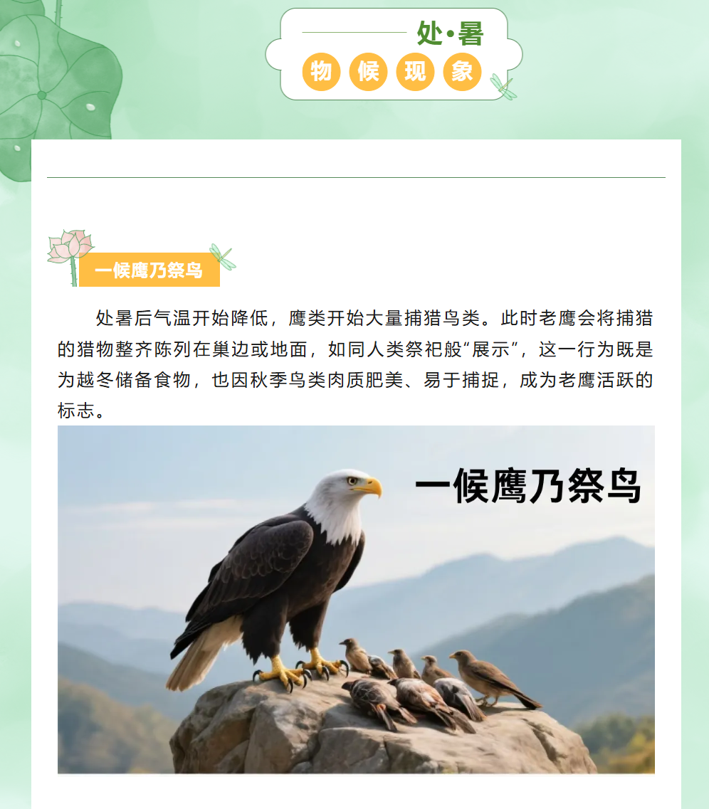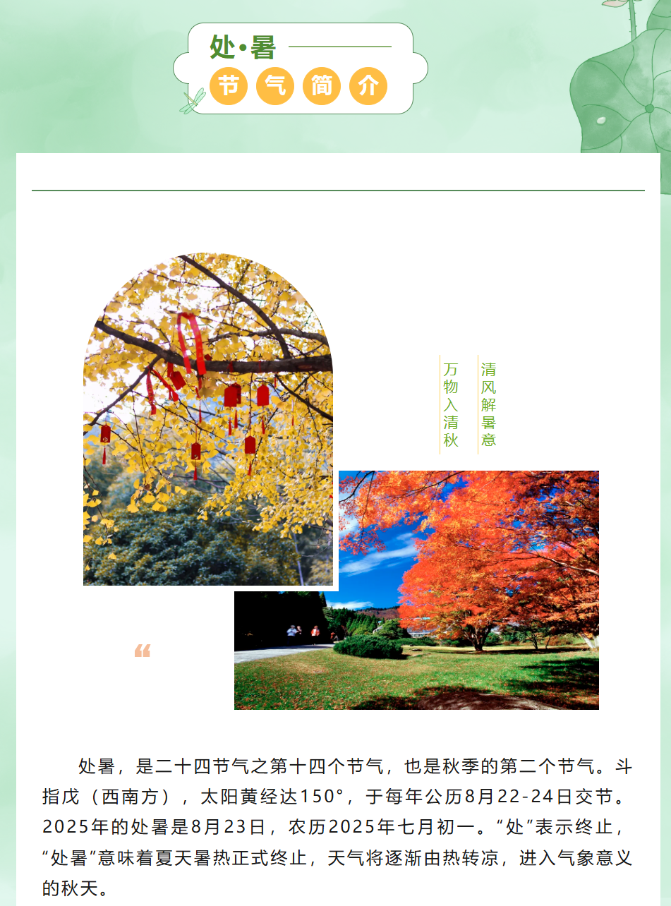 图文简介: 今日处暑 意味着炎热即将过去 凉爽的秋日即将登场 在这个时节 大自然悄然变换着色彩与姿态 为我们带来了一份宁静与清爽